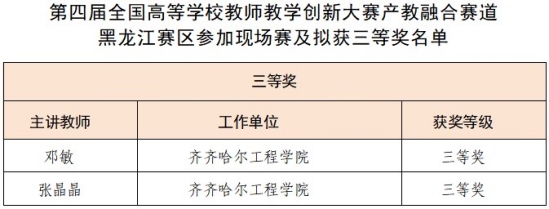 7月10日,由黑龙江省教育厅主办的第四届全国高等学校教师教学创新大赛产教融合赛道黑龙江赛区选拔赛成绩公布,学校建筑工程系张晶晶的《房屋建筑学》课程团队与机电工程系邓敏的《电工电子技术》课程团队均荣获三等奖。