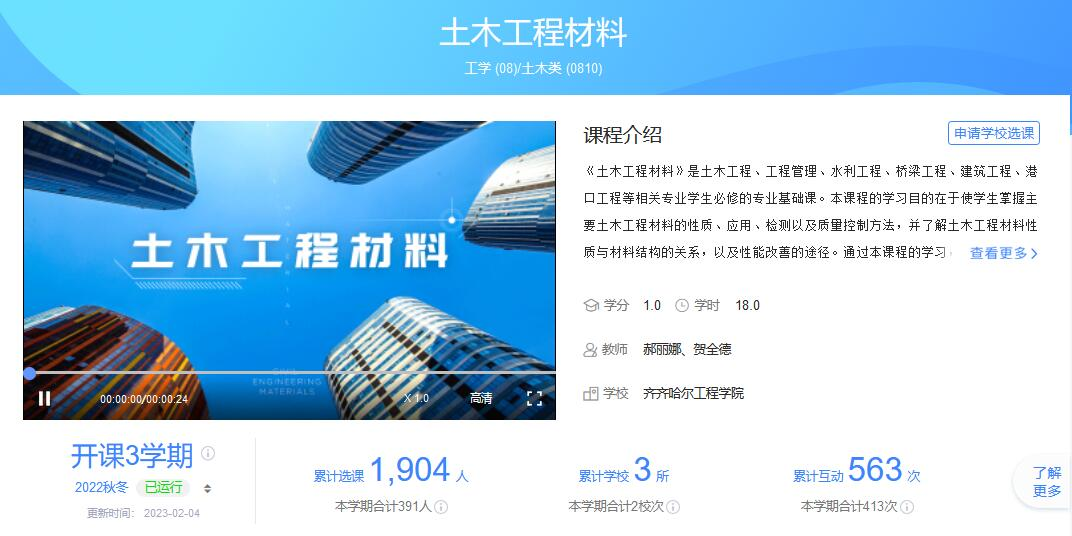 建筑工程系高度重视课程建设及教师的培养,以审核评估为引领,通过以赛促教,提升教师队伍的教书育人能力,以竞赛为抓手推进线上线下混合式教学改革。《土木工程材料》作为一门专业课程自2022年在智慧树平台上线以来,选课学校3所,选课人数近2000人。课程依托智慧树平台开展了丰富的线上线下混合式教学活动,本次比赛获奖是《土木工程材料》课程团队落实FT课程建设理念,推广课程建设成效取得的又一成果。