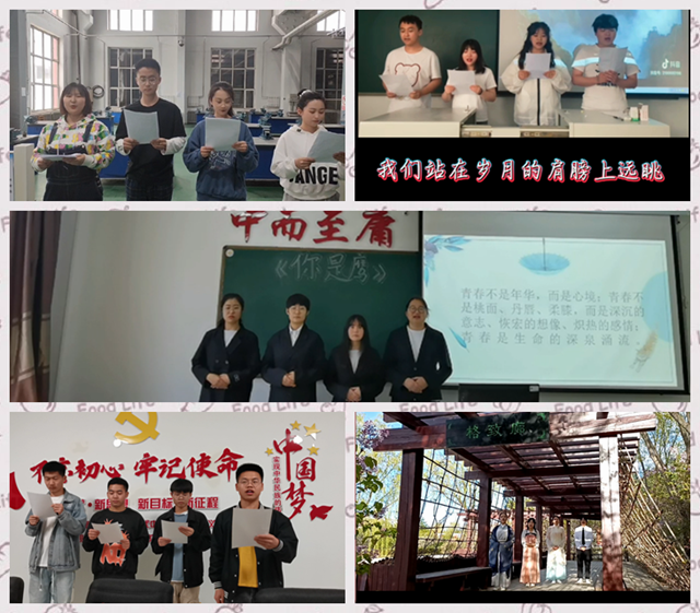 本次朗诵比赛,参赛团队借助身边的校园环境,完成个性化的参赛作品。有的学生参赛朗诵作品的背景画面是专业机床实训场地,“不忘初心、牢记使命”的背景墙,更多的以教室“中而至庸 和而不同”校训等为背景衬托进行朗诵。