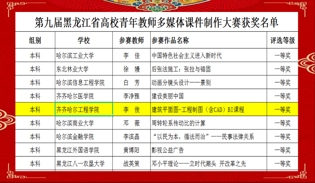 近日,我校建筑工程系教师李俊在第九届黑龙江省高校青年教师多媒体课件制作大赛中荣获本科组一等奖。