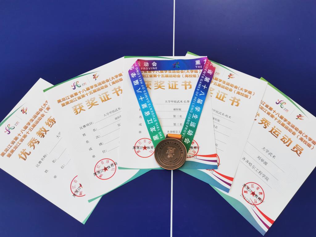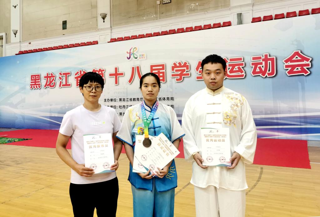 我校武术队的谢阳妮同学获得女子长拳铜牌、女子剑术第四名和女子枪术第四名的好成绩;乒乓球队的刘宇婷、武术队的刘举源同学荣获优秀运动员称号;两个的项目教练员韩淑梅和于壮老师均获优秀教练员称号。