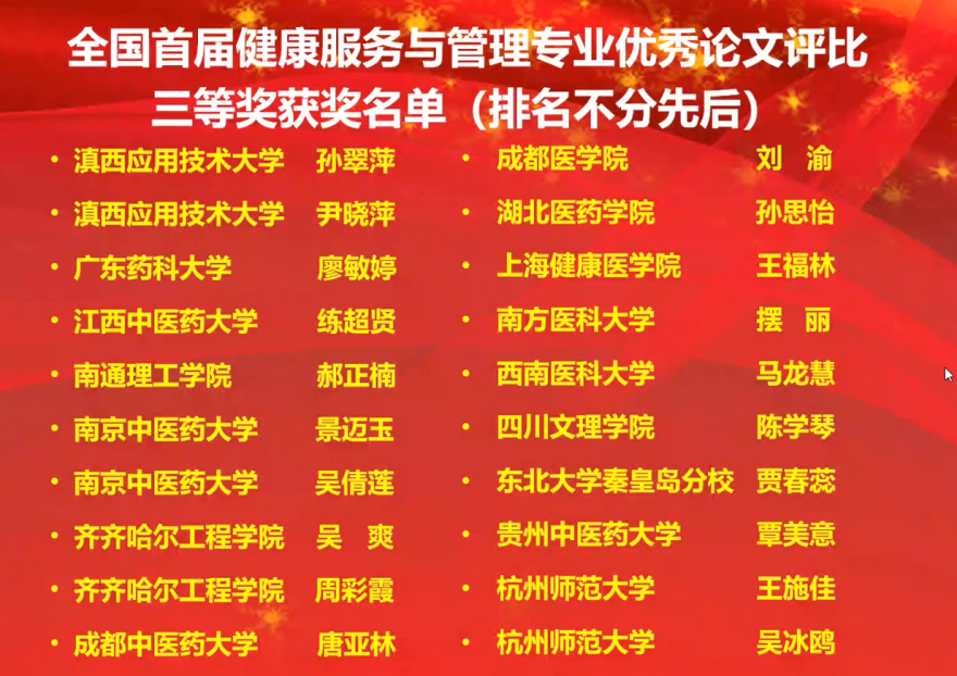 本次大赛包含首届全国健康服务与管理专业优秀毕业论文评比与健康管理沙盘竞赛两部分。我校健管专业遴选6篇优秀毕业论文参与优秀毕业论文评比,姜佳老师被聘为此次论文评比的专家评委。