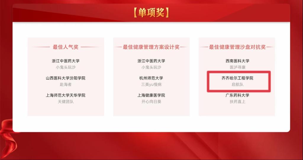 我校健康与护理系健康服务与管理专业201班王朝敏、202班沈露露和常远参加健康管理沙盘竞赛部分,专业长毕茎娜和姜佳老师为比赛指导教师。学生在两位指导老师的指导下,结合“互联网+”和中医养生馆等方面进行健康管理方案设计,利用课堂实践和课余时间刻苦练习情景模拟沙盘,深入挖掘模拟沙盘中社区人群合适的健康管理方案,拓展自己知识面。在答辩环节,小组分工明确,思路清晰,层次分明,面对老师的提问,积极应答,沉着冷静。经过11月11日至18日的第一阶段“健康管理方案设计”、11月26日的第二阶段“健康管理情景模拟沙盘竞赛”和11月27日的第三阶段“线上答辩”这三个阶段的激烈角逐,最终取得优异的成绩。