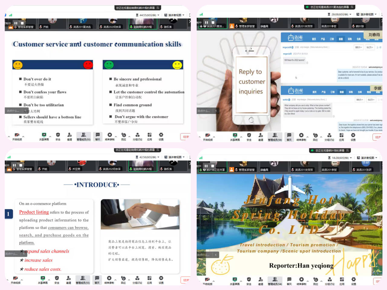 本次大赛共有线上初赛和线上决赛两个环节。初赛环节,学生3至4人组成17个团队,根据大赛要求提交跨境电商运营与推广方案(演示文稿)。经过英语专业三位校内评委共同商讨确定5个团队进入决赛。