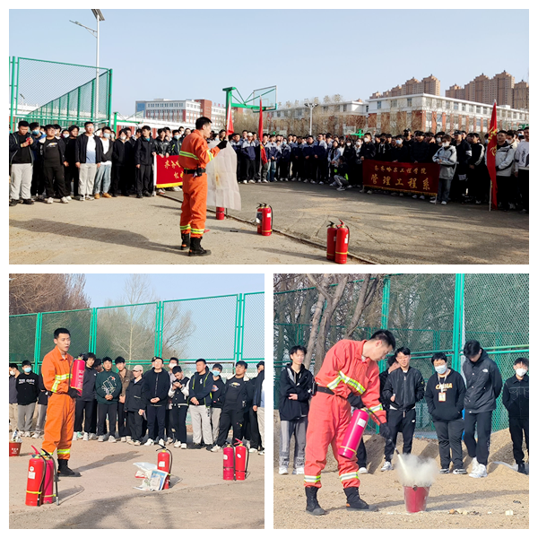 疏散演习结束后,保卫处倪柏亮向学生讲解了消防知识及消防器材的鉴别和使用方法,现场为师生进行了灭火实操。学生亲身体验消防器材的使用效果,演练远距离抵达火源灭火、在火源上风向或侧风向灭火等项目。
