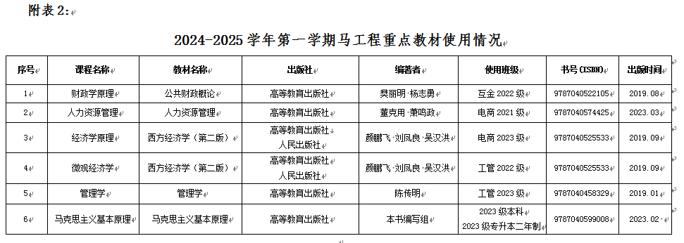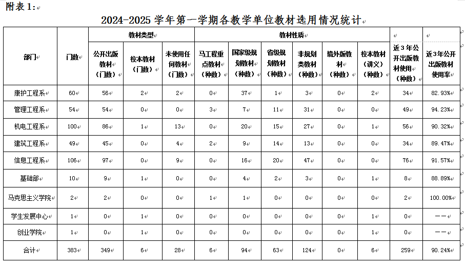 2024-2025学年度第一学期马工程重点教材使用率达到100%(详见附表2),使用的近三年公开出版教材占比是90.24%,使用非近三年公开出版教材28种(管理工程系3种、建筑工程系4种、康护工程系7种、机电工程系6种、信息工程系7种、基础部1种),使用本校教师主编、参编的教材有9种,自编教材(讲义)6种。(详见附表3)。