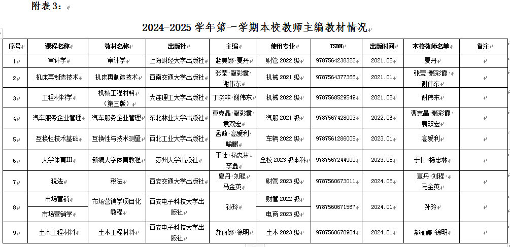 教务处严格按照《齐齐哈尔工程学院教材管理办法(修订)》中关于教材选用的相关规定,对教材选用的全程进行监督,各开课单位均认真落实文件要求,不存在违规现象。经各开课单位教材工作小组审议(公示无异议),2024-2025学年度第一学期所有专业所选用的教材均符合各专业人才培养方案的要求,无思想政治错误,符合党和国家方针政策,教材内容具有较强的理论性、系统性和先进性,无价值导向不正确或教材封面与插图不符合大众审美等问题。教材选用信息如下: