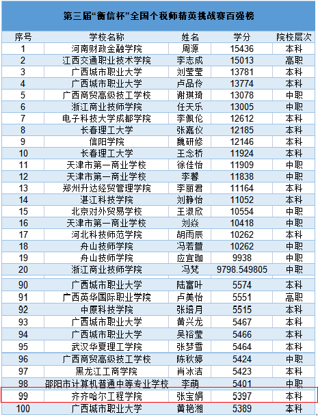 财务管理专业的学生,除了荣获本次比赛的团体一等奖之外,通过学生个人成绩的排名,财管204班的张宝娟同学,在近两万的参赛选手中,入选了第三届“衡信杯”全国个税师精英挑战赛百强榜,既获得了个人荣誉,又为团体战贡献了力量。