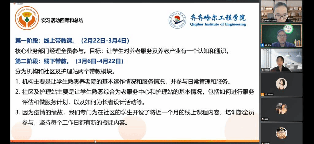 4月23日9时,健康与护理系和上海乐邦养老服务有限公司共同组织线上“访企拓岗促就业”校企合作专题会议。副院长张振笋、健康与护理系负责人郭玲玲主任、上海乐邦养老服务有限公司董事长李侠等校企业双方领导及相关专业师生代表参加会议。