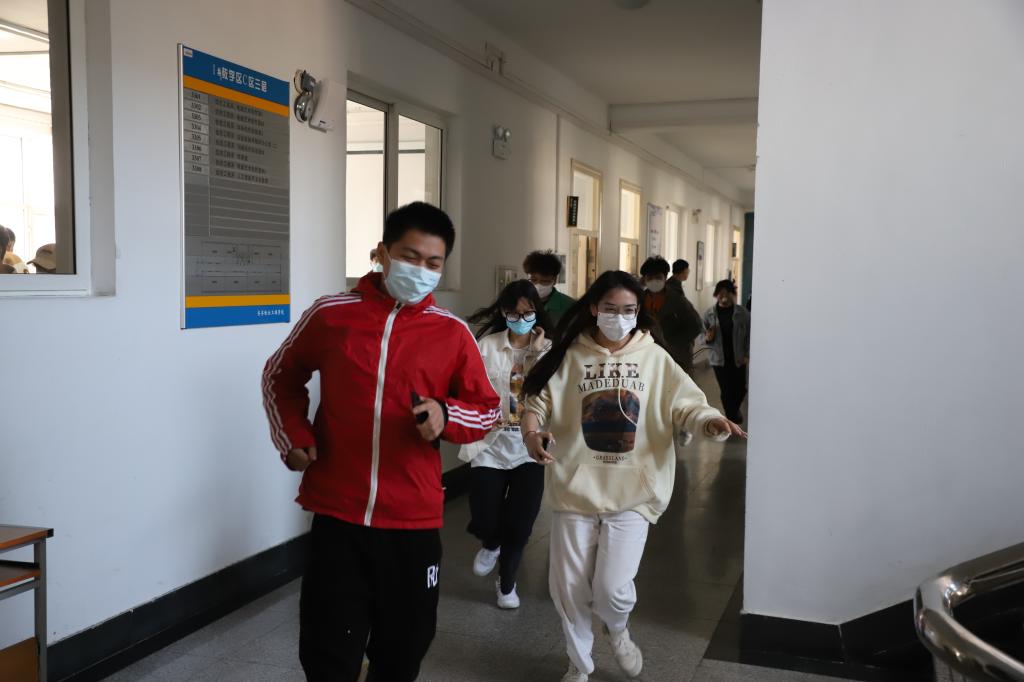 演练正式开始,随着一声令下,大家按照疏散预案,在楼层引导员的指令下有序的前往指定地点,在规定时间内全部安全到达。演练过程中师生配合得当,快速有序撤离,在一号教学区楼下集合,无拥堵等现象发生。