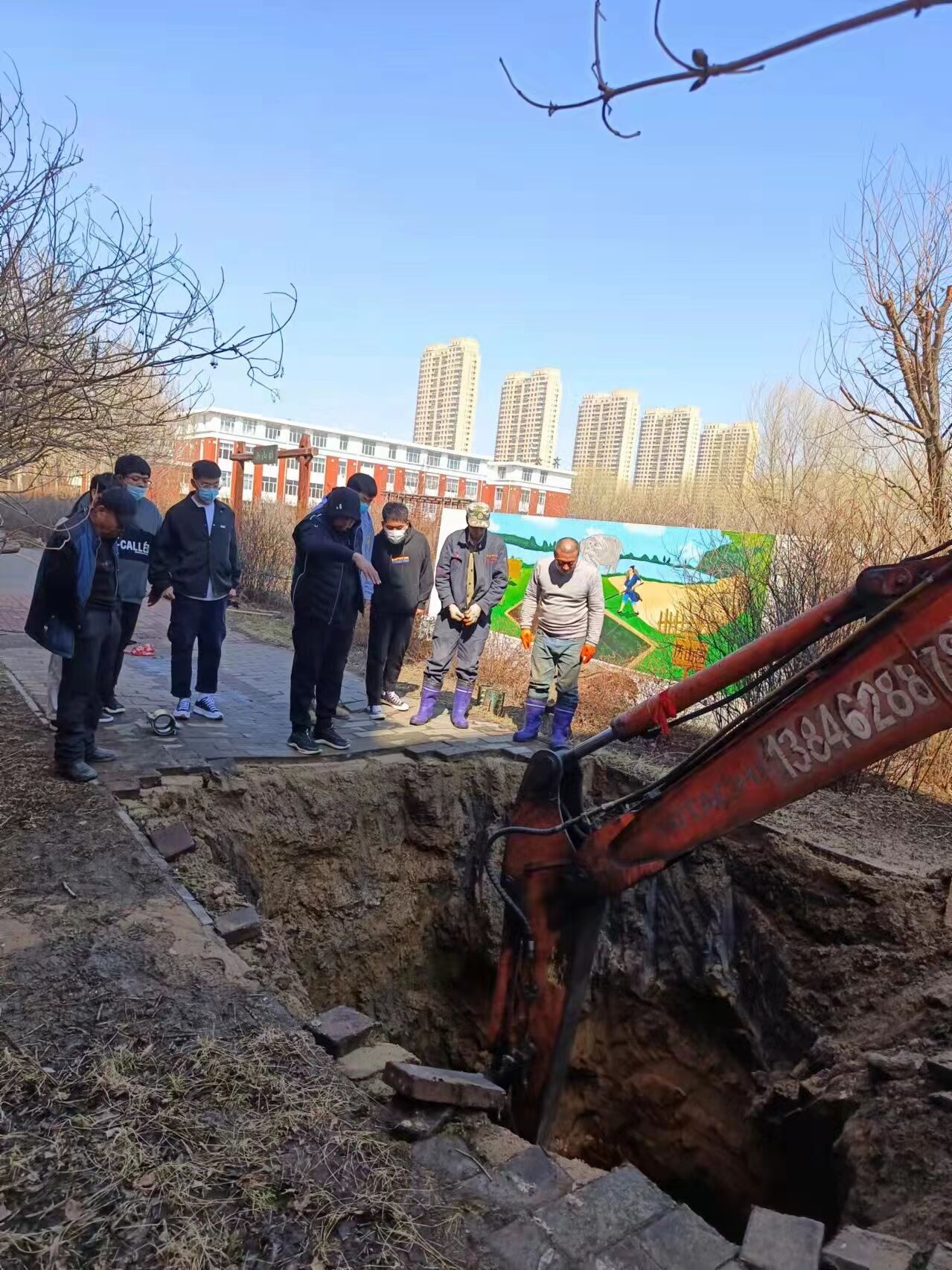 4月13日,学校五号教学区楼后消防供水管线突然漏水。总务处、保卫处迅速组织人员并安排机械进行抢修。建筑工程系适时派学生现场观摩学习。