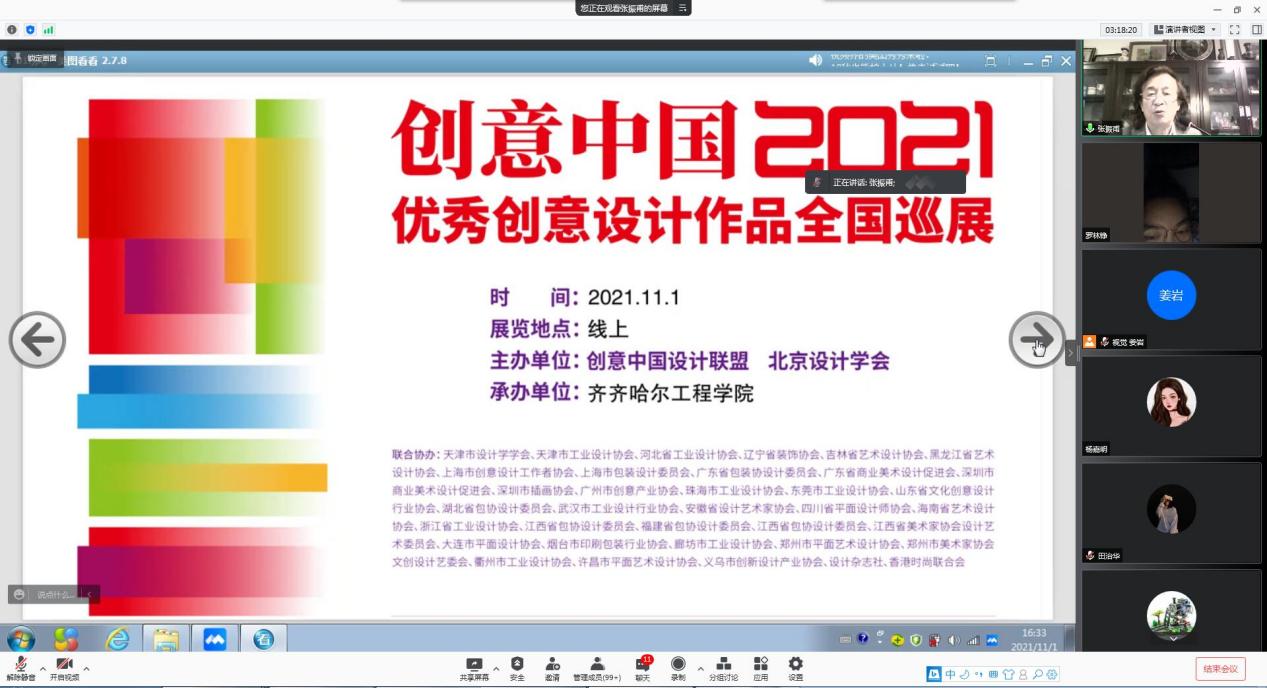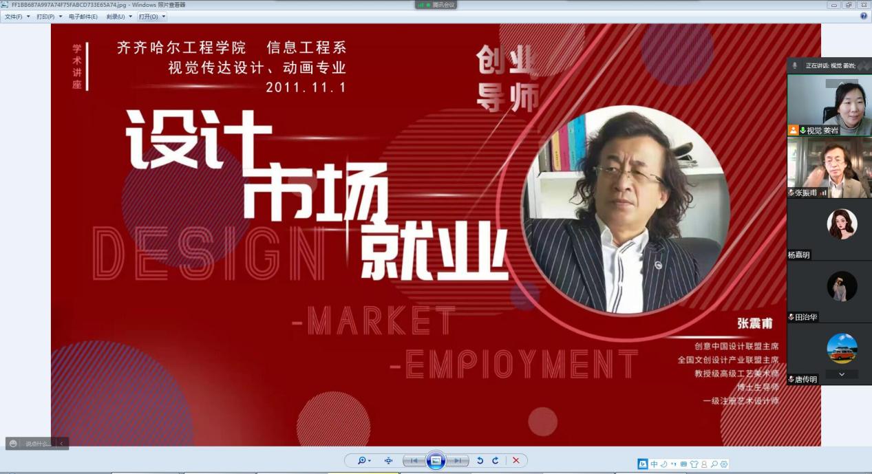 11月1日下午,视觉传达设计专业和动画专业通过腾讯会议平台,联合举办了线上题为“设计、市场、就业”专家讲座,特邀创意中国设计联盟主席、全国文创设计产业联盟主席、高级工艺美术师、博士生导师、一级注册艺术设计师张震甫教授主讲。视觉传达设计专业长姜岩主持,视觉传达设计专业全体学生和动画专业2020级学生,共300余人参加了此次讲座。