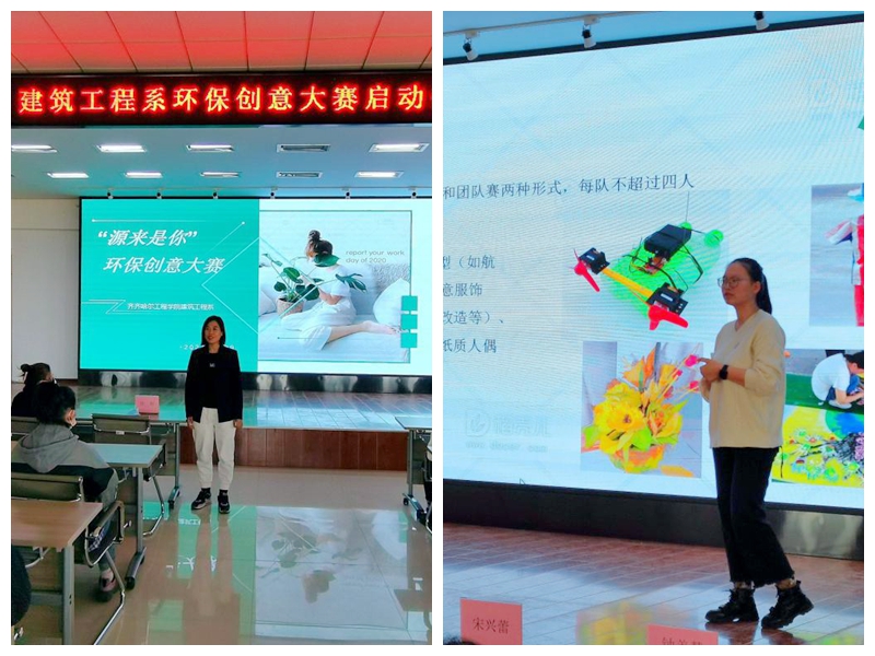 仪式开始,侯聪超为学生展示了几个环保作品的创意理念,强调了本次大赛的现实意义与重要性。随后徐明介绍本次环保创意大赛的主题、奖项设置等。侯聪超在仪式上详细介绍了竞赛规则、考核流程及评比标准,她表示,环境保护事业功在当代,利在千秋,作为齐工程人,要共筑环保梦、中国梦,全面推动“绿色建筑”高品质、高质量发展,让生活更环保,让环保更有创意。