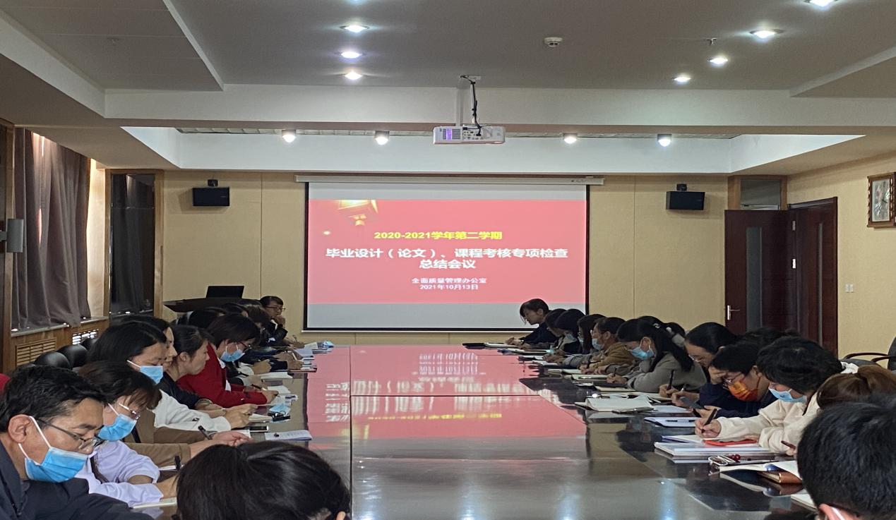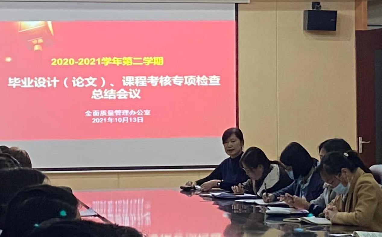 为进一步规范毕业设计(论文)、课程考核工作的过程管理,持续改进毕业设计(论文)、课程考核工作质量,全面质量管理办公室于10月13日下午在图书馆603南会议室召开2020至2021学年第二学期课程考核、2021届本科毕业设计(论文)专项检查总结会。学校副院长蒋春艳出席,教务处与全质办相关干部、各系(部、中心)主任、教学工作副主任、专业负责人参会。全面质量管理办公室主任孟艳辉主持会议。