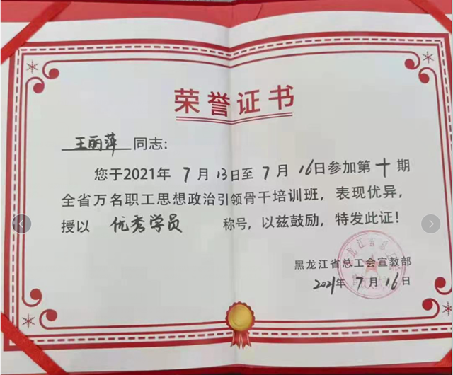本次培训会上,学校两位参训教师均获得黑龙江省总工会授予的第十期全省万名职工思想政治引领骨干培训“优秀学员”荣誉称号。