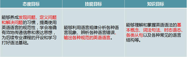 根据英语专业人才培养方案中课程与毕业要求的关系矩阵,学生通过《英语语法》课程的学习,掌握英语听、说、读、写、译方面的专业基础知识,并应用翻译基本理论和技巧从事基础翻译类工作。具体目标如下: