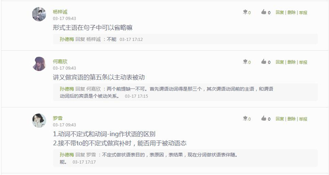 二是激励学生发声,表达心中所想。教师布置的重要作业之一,就是要求学生积极回复各种主题讨论——提问的、造句的、唱歌的、吐糟的,鼓励学生“敢想敢发声”,从中锻炼知其然并知其所以然。每周,师生共同选出优秀的帖子在学习通群聊中展示,由教师给予一定的加分奖励;对未及时完成任务的学生进行提醒和批评,并持续关注学生的学习动态。