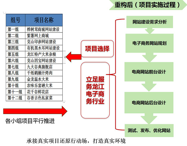项目选择依据专业培养目标,立足服务龙江电子商务行业,选择了中国网库网站建设项目,以学生小组为单位实施项目,高年级项目和低年级项目组对组进行对接,高年级负责指导低年级学生完成农产品推广以及网络营销工作任务,同时为自身电子商务网站建设工作任务积累素材,实现工作任务无缝对接。各小组项目还原行动场,打造真实环境,平行推进,完成项目过程中注重培养学生服务地方经济发展的社会责任感和家国情怀。