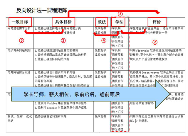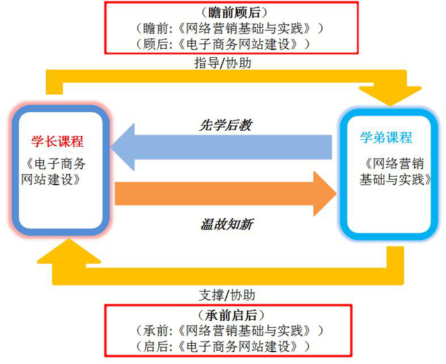 承前启后,指正在学习《网络营销基础与实践》的2018级学生,需要在学长的指导下学习《网络营销基础与实践》相关课点并完成对应项目工作任务(承前),项目成果为2017级学生《电子商务网站建设》提供支撑素材。同时,在学长指导下,2018级学生“先学”后续课程《电子商务网站建设》的相关内容,为教师“后教”做准备(启后)。