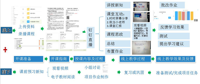 (一)“以学生为中心”的实施过程。一是课前,教师上传学习资料和录播视频课程,学生提前观看视频和阅读电子教材。《企业形象设计》课的基础理论知识部分,适合学生进行线上学习,就通过微视频的录制、剪辑、制作和发布,将该部分知识整合成 16个视频任务点,每个视频时长控制在 10-20 分钟,这样的微视频学习符合学生碎片化的学习习惯,有利于激起学生的学习兴趣和注意力,保障线上课程学习效果。这些微课视频资源建设好后,通过在线教学平台发布,供学生进行线上学习。二是课中,教师进行知识讲授,实时组织课堂互动,采用屏幕留言及钉钉连麦的方式进行知识问答,促使学生人机相伴,实时参与互动。同时,通过“我当小老师”这一互动环节,锻炼学生的语言表达能力,让学生产生课堂主人翁的自信感,进而实现以学生为中心的教学。三是课后,教师通过作业批改来反馈学习成果,提出相应的学习建议;学生通过课后的小组讨论,完成项目任务制作,复习和巩固知识。