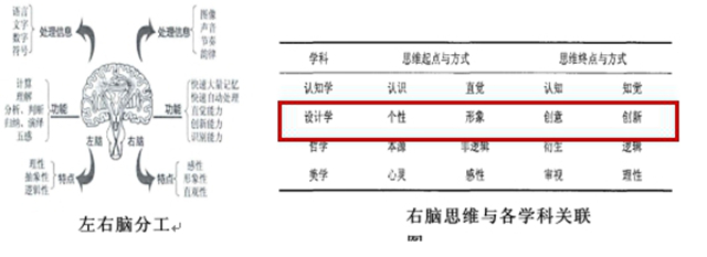 (一)《企业形象设计》教学基于脑科学原理。《企业形象设计》是视觉传达设计专业学生的专业必修课程,属于设计学范畴教学内容。以脑科学原理分析,人的右脑处理图形、图像、声音等内容,具有感性、形象性和主观性等特点,因此需要利用左右脑分工及右脑思维与艺术学的关系进行课程设计。首先,要让学生建立课程的认知,通过发散思维途径,引导学生进行创作,主要有:头脑风暴、设计和分析。其次,要让学生通过对企业形象的直觉思维和逆向思维进行创意设计,寻找个性来源,将创意和结果传达左脑进行信息处理,最后形成创意设计终稿。课程教学根据脑科学原理,掌握学生思维的起点方式与思维终点,组织进行一个从个性到创新的学习过程。