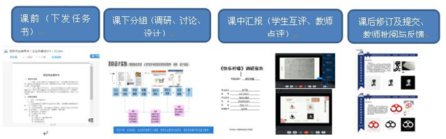 (二)“以学生发展为中心”的项目设计与实施。课前,学生成立小组,进行项目任务的选取并进行调研分析,依据项目任务指导书完成设计工作。课上,项目组的学生进行汇报,根据同学互评、教师点评来完善设计的不足。课后,对设计进行修改并完成项目作业,体现学生团队的合作与协调沟通能力。通过这一过程,实现以学生发展和学生学习效果为中心的项目课程设计。