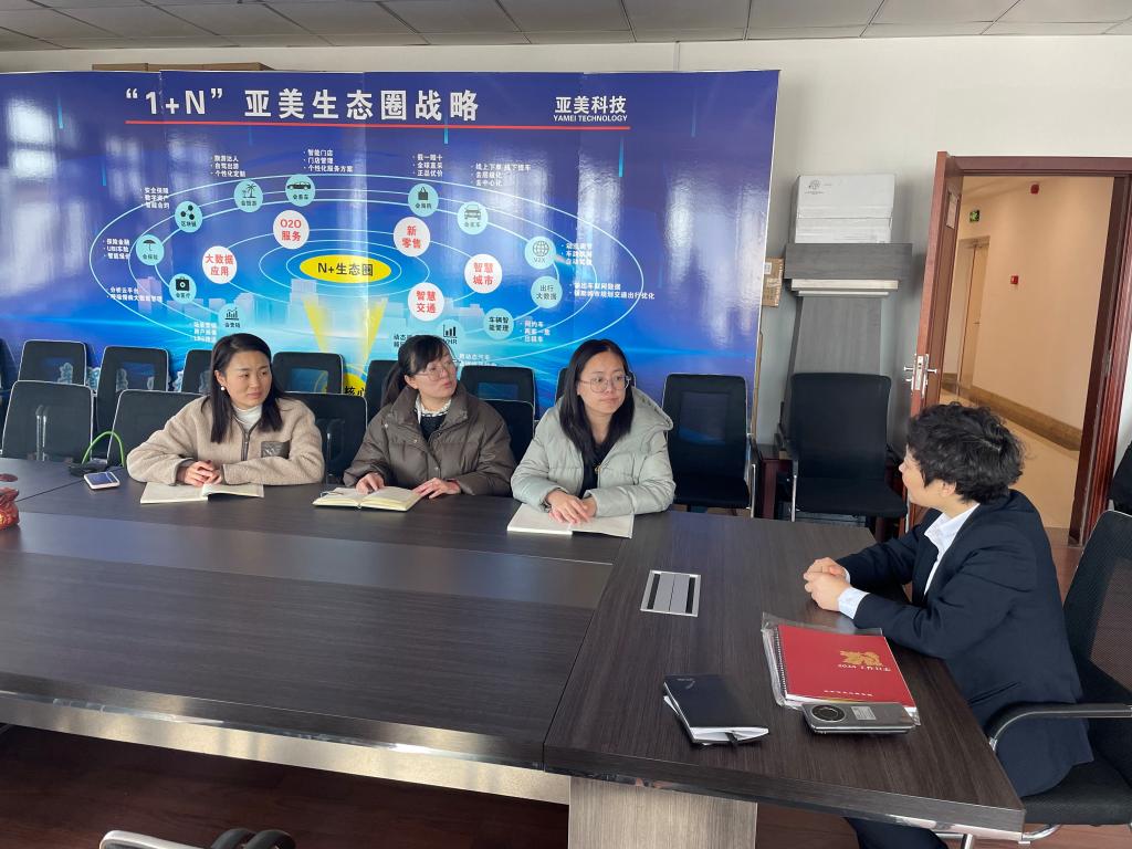 亚美智汇数据运营管理有限公司负责人张娜为学校教师介绍了企业的主要业务、公司规模、用人需求、员工培训等基本情况,希望与学校建立合作关系,从员工学历提升、职业技能培训、优质毕业生就业基地建设、开展“互联网+”创新创业大赛合作等方面加强沟通交流,开展合作。同时,期待校企合作可以拓展领域,提升层次,建立健全实习基地,为学生专业学习和实践提供更好的平台,实现学校与企业优势互补、协同发展、互利共赢。