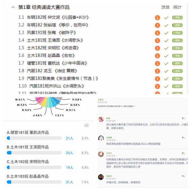 本次经典诵读大赛面向全校学生举行,经过初选有20个作品进入决赛。决赛阶段,参赛学生按照比赛要求,分别录制一段完整的朗诵作品视频,上交大学语文教研室。教师们上传学生朗诵作品至超星泛雅学习平台,参赛学生及各班同学进入学习通群的“经典诵读比赛”鉴赏朗诵作品,并依据评分标准,投票评选。