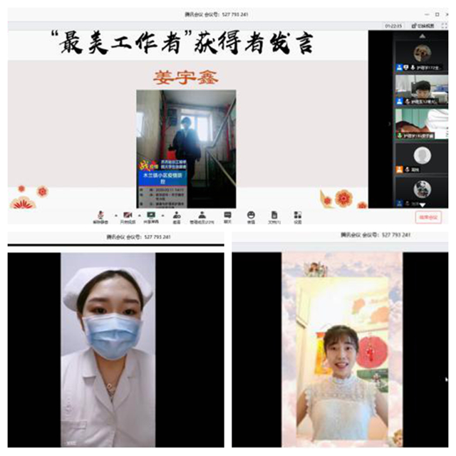 师生们共同回顾欣赏了反映本次活动的优秀作品,同学们利用课余时间,以不同形式展现了南丁格尔精神和当代大学生朝气蓬勃的风貌。系“形象大使”获得者、应届毕业生郭金娜同学,在所录制的视频中与学弟学妹们分享了自己参加疫情防控的经历和感受,鼓励大家扎实学习专业知识,夯实专业操作技能基础。“最美工作者”获得者、护理学195班姜宇鑫同学在发言中,交流分享了自己主动请缨加入小区疫情防控志愿者队伍,为居民普及疫情防控相关知识,提供生活便利,得到居民认可的经历和感受。