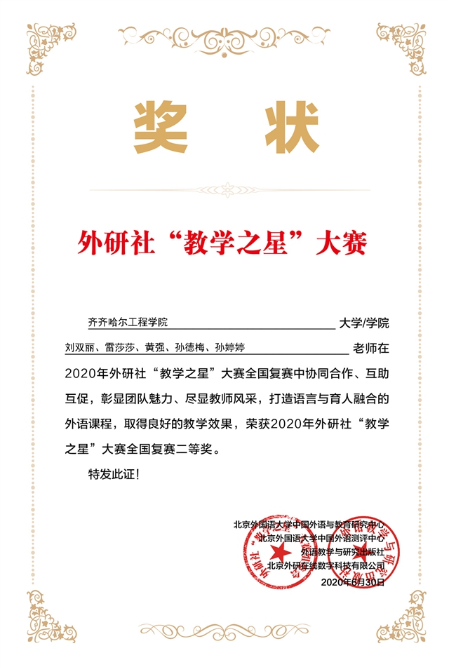 6月30日,由教育部高等学校大学外语教学指导委员会、教育部高等学校英语专业教学指导分委员会和外语教学与研究出版社共同举办的“教学之星”大赛结果揭晓,我校管理工程系由大学英语任课教师刘双丽、雷莎莎、黄强、孙婷婷、孙德梅组成的参赛团队,荣获外研社“教学之星”大赛全国复赛二等奖。