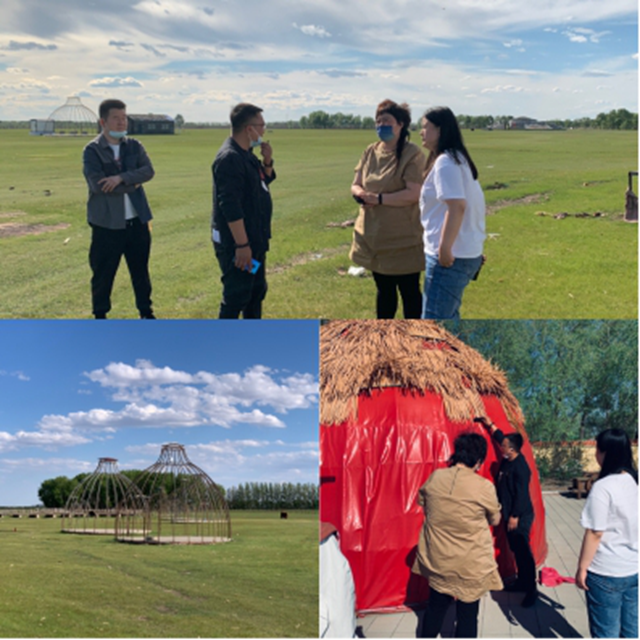 团队一行人跟随当地旅游局领导和达翰尔族博物馆工作人员来到哈拉新村草原,实地考察了蒙古包建筑。在听取了领导和博物馆工作人员的详细介绍后,专业团队一行人了解了此次蒙古包棚面绘制的具体要求和设计思路。接下来风景园林专业将着手对当地15个大小蒙古包,进行民族特色文化为主题的图案设计和绘制。宋老师表示,“梅里斯达翰尔族区是一个有着浓厚民族特色的地区,此次同学们一定要深入了解达翰尔族的文化历史、风土人情,做到知己知彼,争取做出令旅游局和博物馆满意的作品。”