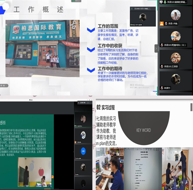 英语181班第三学期答辩会议由英语专业教师齐锐主持,英语181班全体同学参加会议。会议开始,由第三学期实习小组组长汇报实习情况,实习内容,实习感悟,实习总结。每组汇报结束之后,由齐锐老师对每组实习进行点评。英语181班裴爽说道,通过第三学期实习,充分意识到了教学经验需要长时间不断积累,实践以及总结。英语191班第三学期答辩会议由英语专业负责人康琦主持,英语191班全体同学参加会议。在此次线上答辩活动中,英语191班龚小芬同学对自己实习工作进行了总结,她认为通过第三学期锻炼了发挥想象的潜力,提高了独立思考问题的能力。英语201、英语202班第三学期答辩会议由英语教师郭慧莹主持,刘春雨同学谈到,通过学习可以进一步提高专业知识,实习是为了更好的融入社会,更好完成将来的工作,为社会做出贡献。