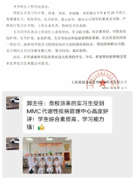 自2021年6月健康与护理系,健康服务与管理专业首届毕业生(2018级)开始毕业实习以来,短短3个月,先后收到天津市第四中心医院国家标准化代谢性疾病管理中心、哈尔滨精神专科白渔泡医院、上海量健企业管理咨询服务有限公司等多家实习单位的表扬信,信中对我校健康服务与管理专业学生专业实践能力以及综合素质给予高度认可,称赞我校健康服务与管理学生医学基础扎实、基本技能操作熟练,明确表示2022年希望接收更多毕业实习生。