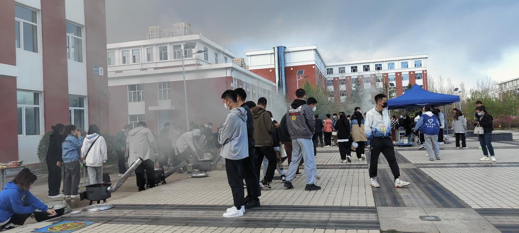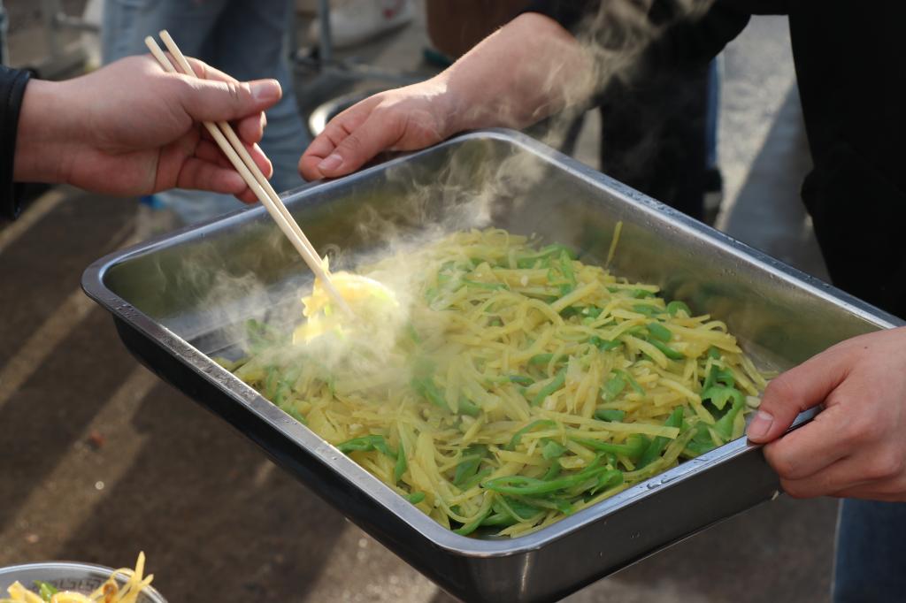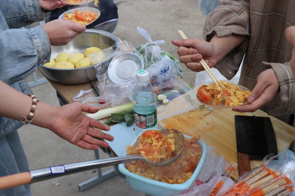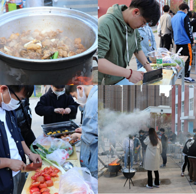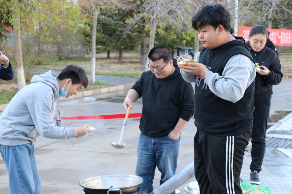 老师们也大显身手。郭磊老师做的豆角炖排骨得到了大家的一致好评;孙晓芳老师在微风细雨里为同学们煮上热乎乎的面条,同学们吃在嘴上暖到心里。