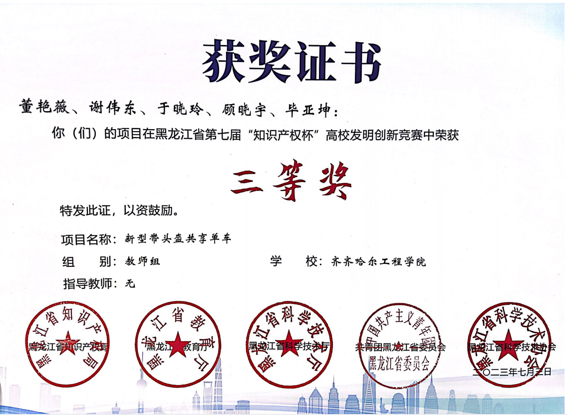 近日,黑龙江省第七届“知识产权杯”高校发明创新竞赛圆满闭幕。我校三支队伍获奖,一支获教师组三等奖,另两支获学生组三等奖。