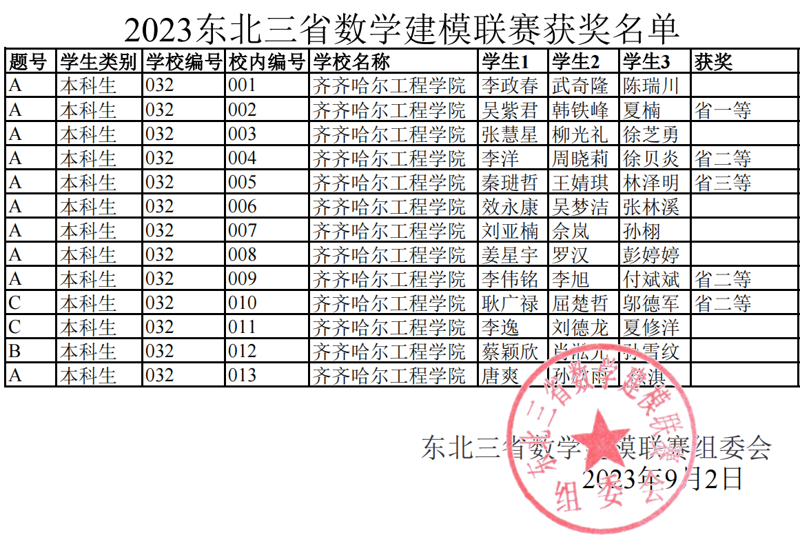 近日,2023年东北三省数学建模联赛结果揭晓:我校五个学生团队获奖,其中两个团队分获一三等,三个团队皆获二等奖。