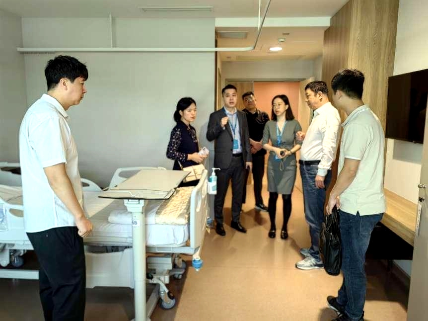 考察团一行人在中大医院业务发展部经理带领下对医院门诊科室、住院部进行参观,并对医院历史、开设科室、院内环境及医院智能化服务应用实施进行详细介绍。