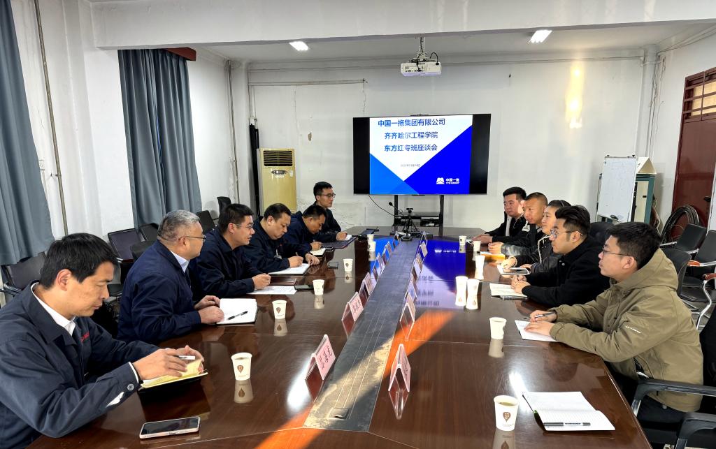 11月24日上午,在中国一拖集团有限公司,“东方红专班”召开阶段性工作总结会。机电工程系副主任敖林喆、学工负责人郭明敬、电气专业长刘智等六人与中国一拖集团有限公司人力资源部副部长潘转朝、大拖分厂经理郭振杰、中小拖党委书记王彦以及分厂人事部长等共同参会。